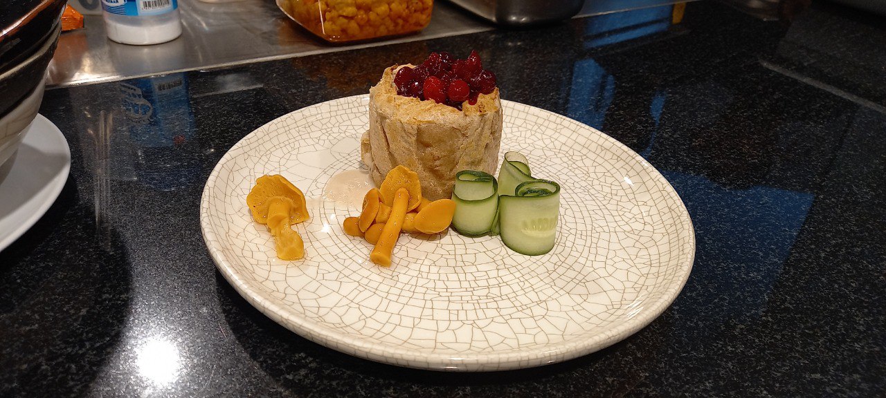 - Пирог русский с нутрией и белыми грибами. С соусом из клюквы и опятами маринованными.