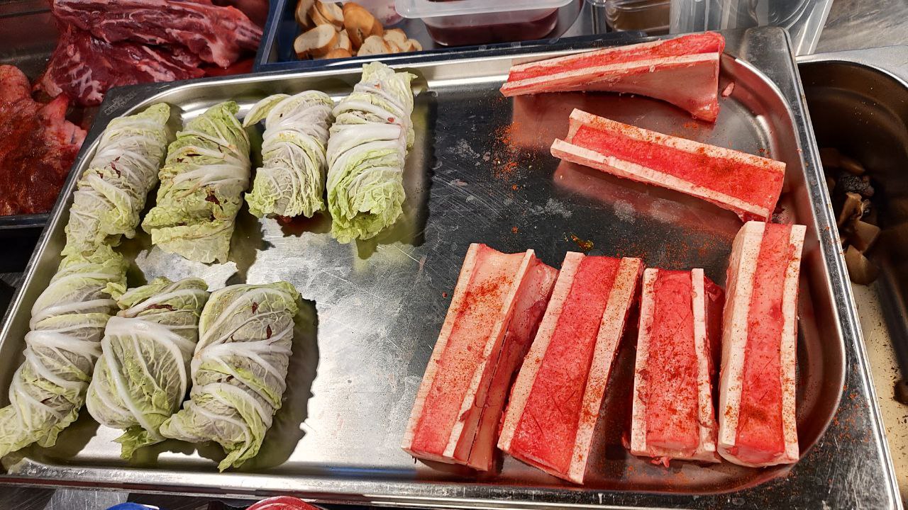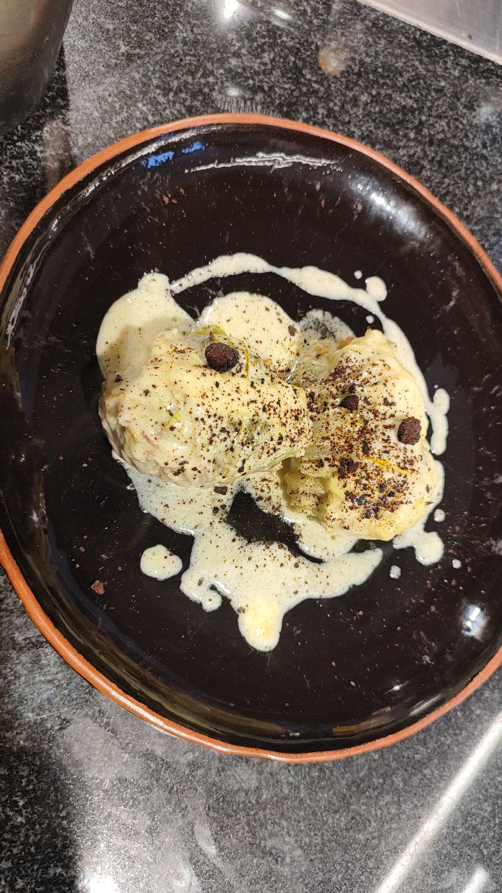 - Голубцы из косули с кус кусом в пекинской капусте соусом бешамель.