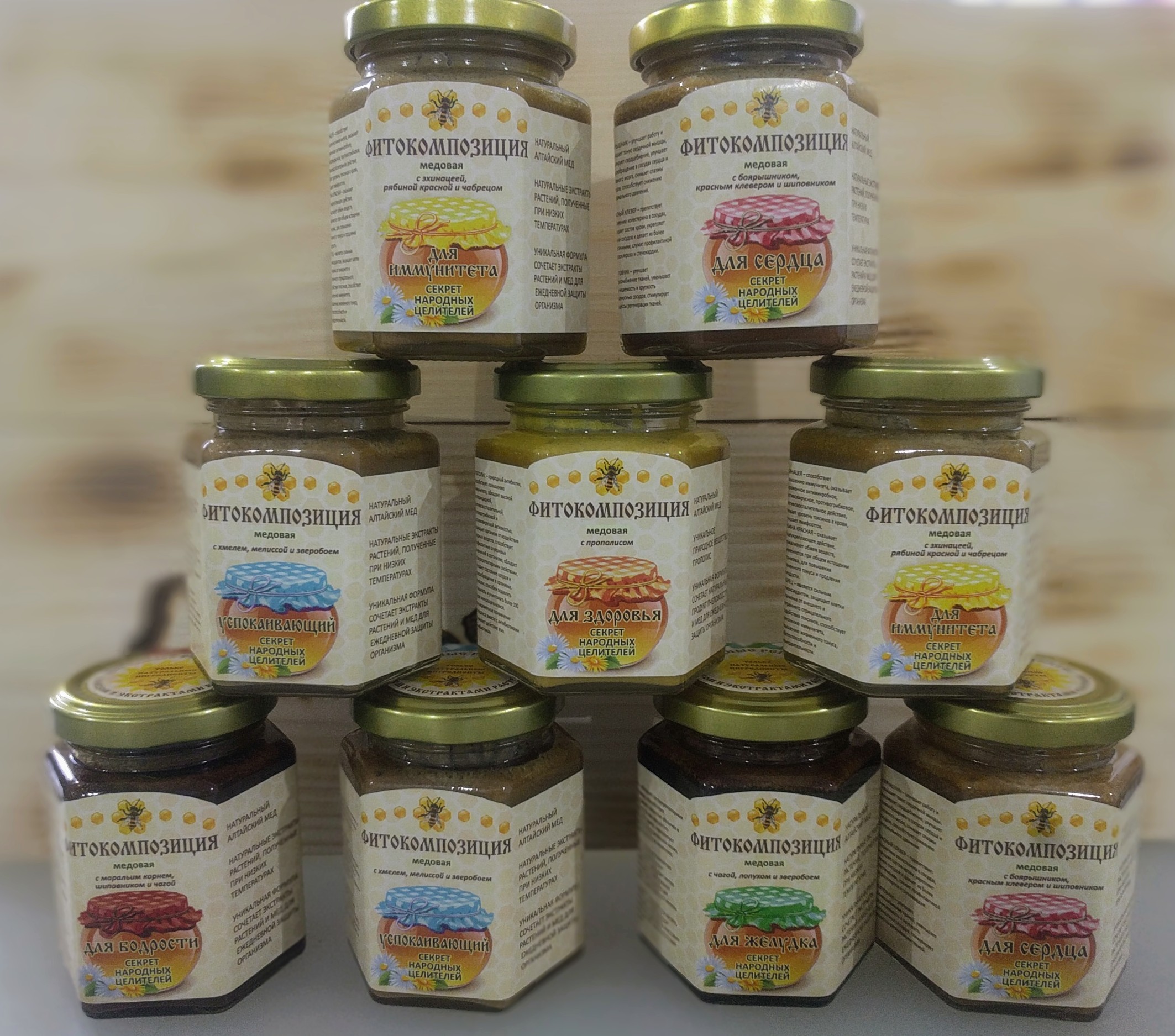 Состав: Мед натуральный, густые концентрированные вытяжки чаги (березового гриба), лопуха, зверобоя