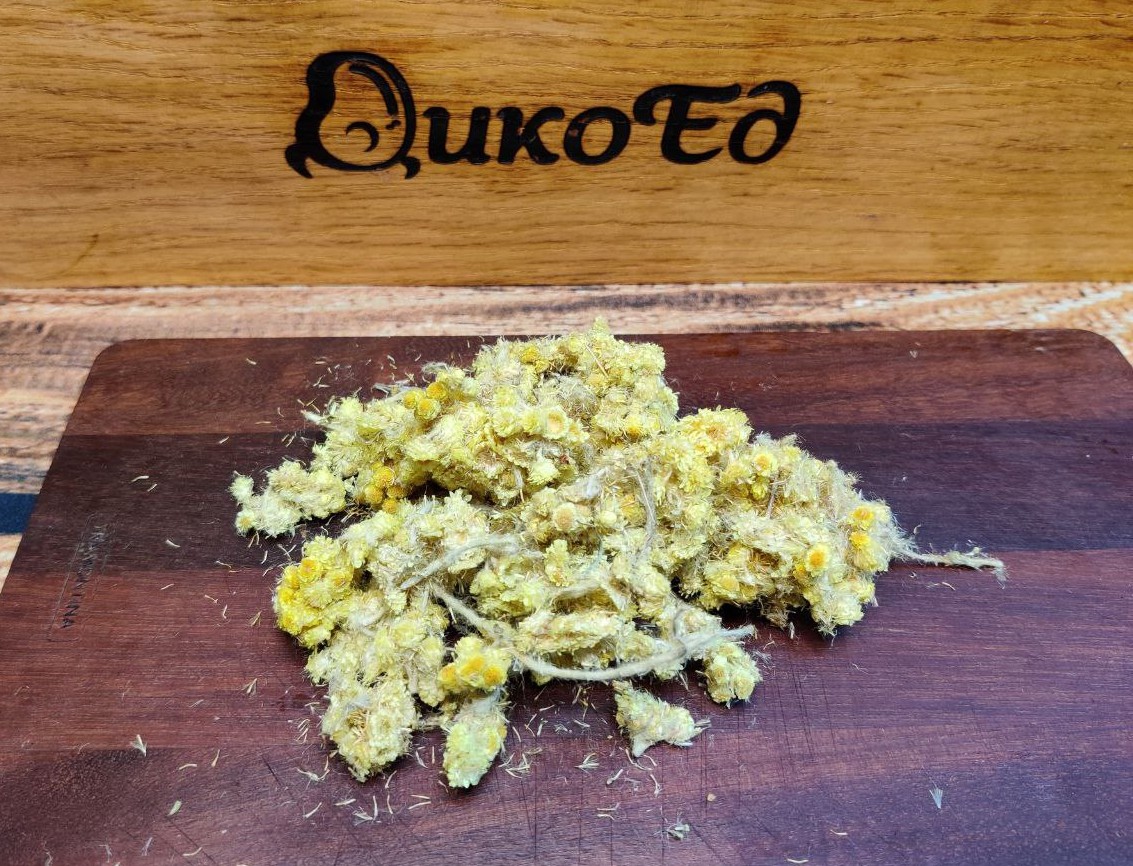 Сушеный бессмертник - невероятно полезная трава, используется для чаев и тонизирующих напитков. В составе: витамин С, минеральные соли, дубильные вещества. В природных условиях траву легко узнать по насыщенно-желтым соцветиям. Бессмертник активно используется в фитотерапии, медицине, для создания эфирных масел. Обладает бактерицидным и антисептическим действием, лечит ожоги, раны, восстанавливает кожу. Охотники добавляют бессмертник в свой фирменный чай.